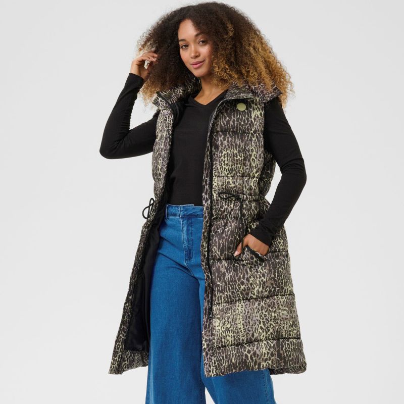 Quilted long vest features a straight silhouette, stand-up collar with snap buttons, full double-zip front, side zip pockets, and a sleek, soft finish.