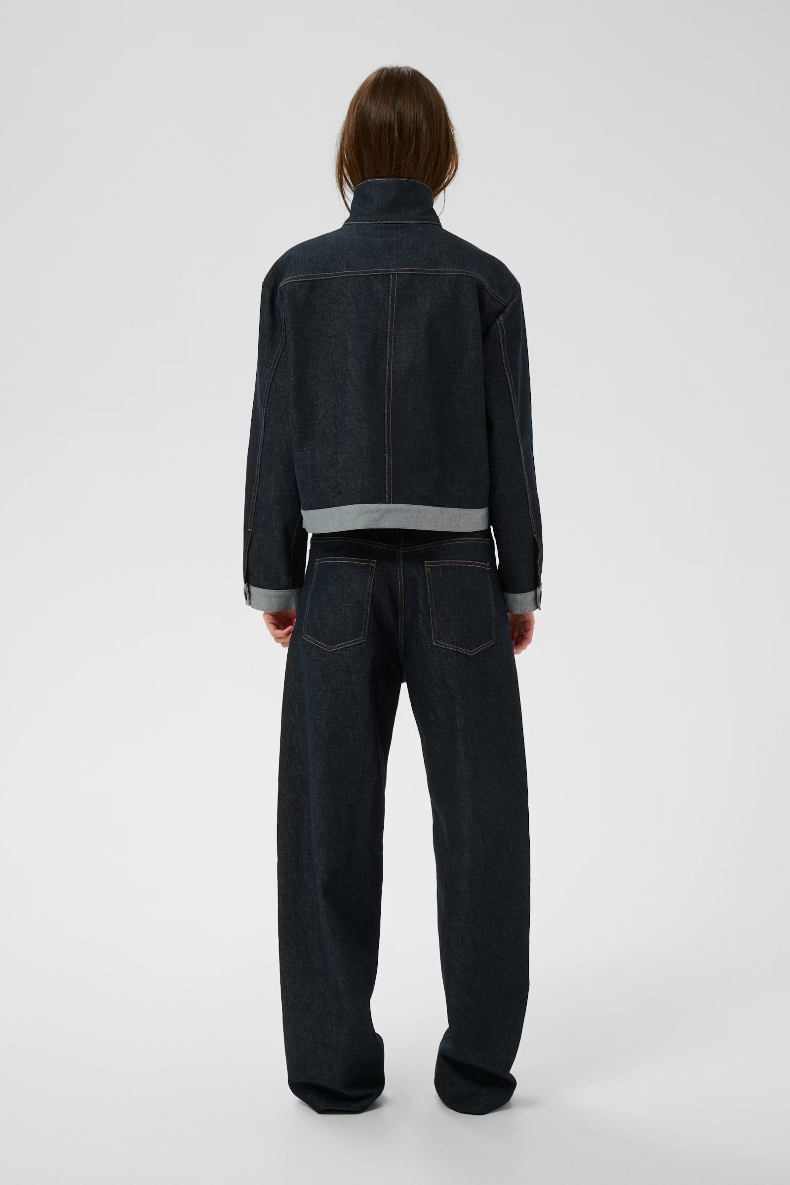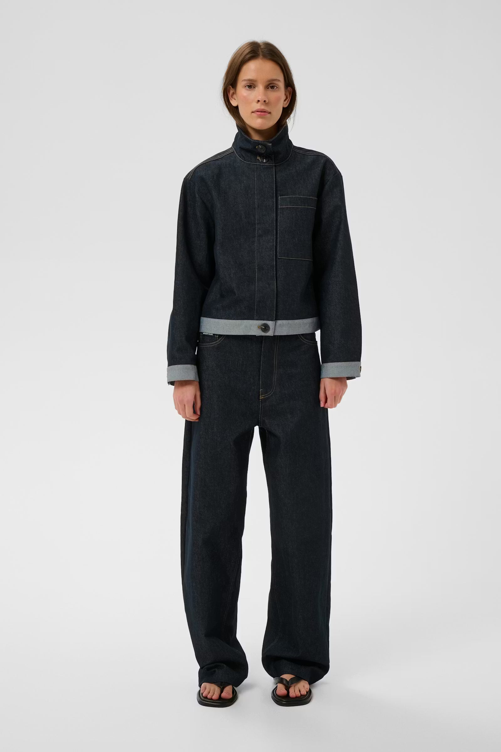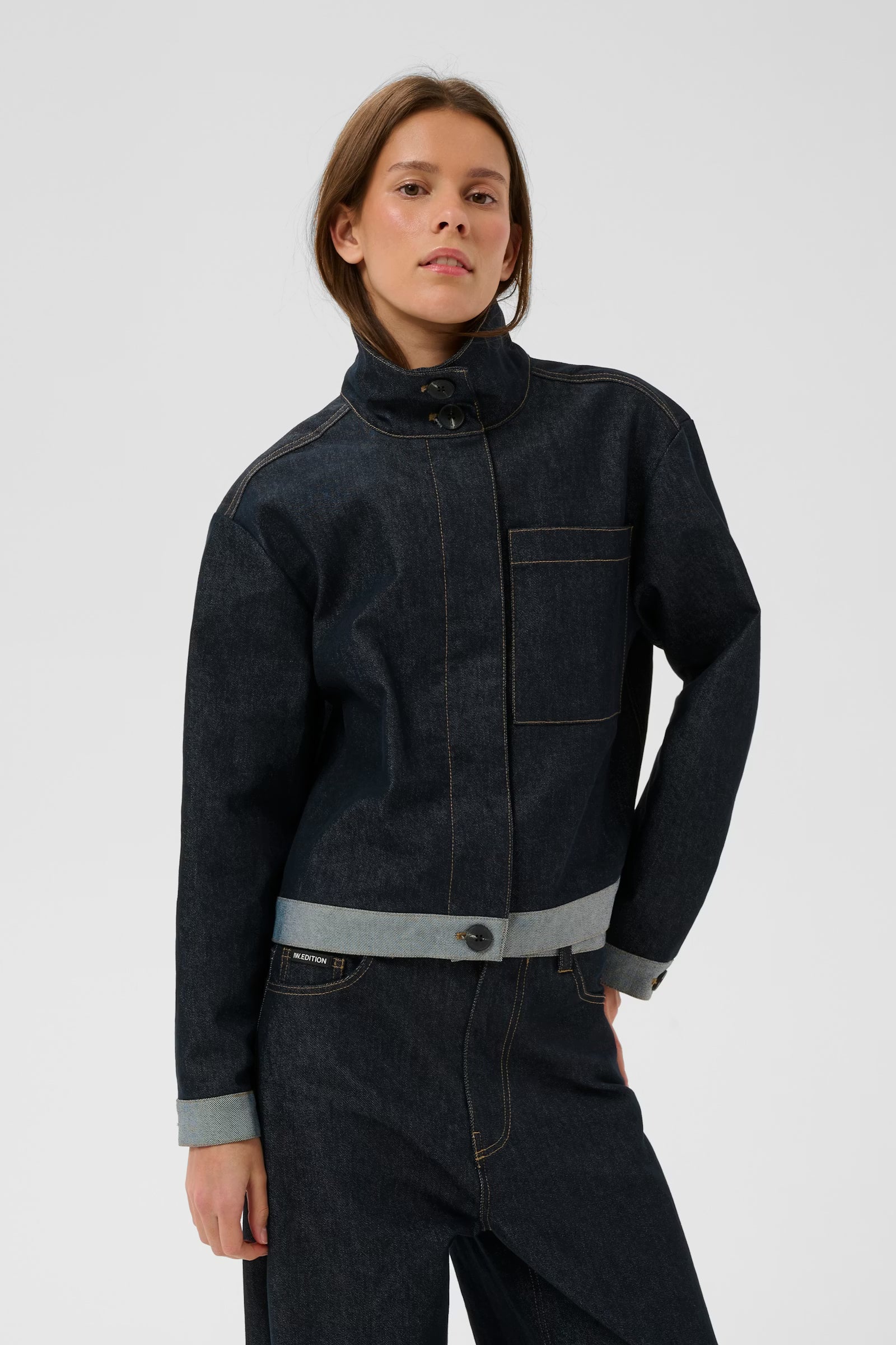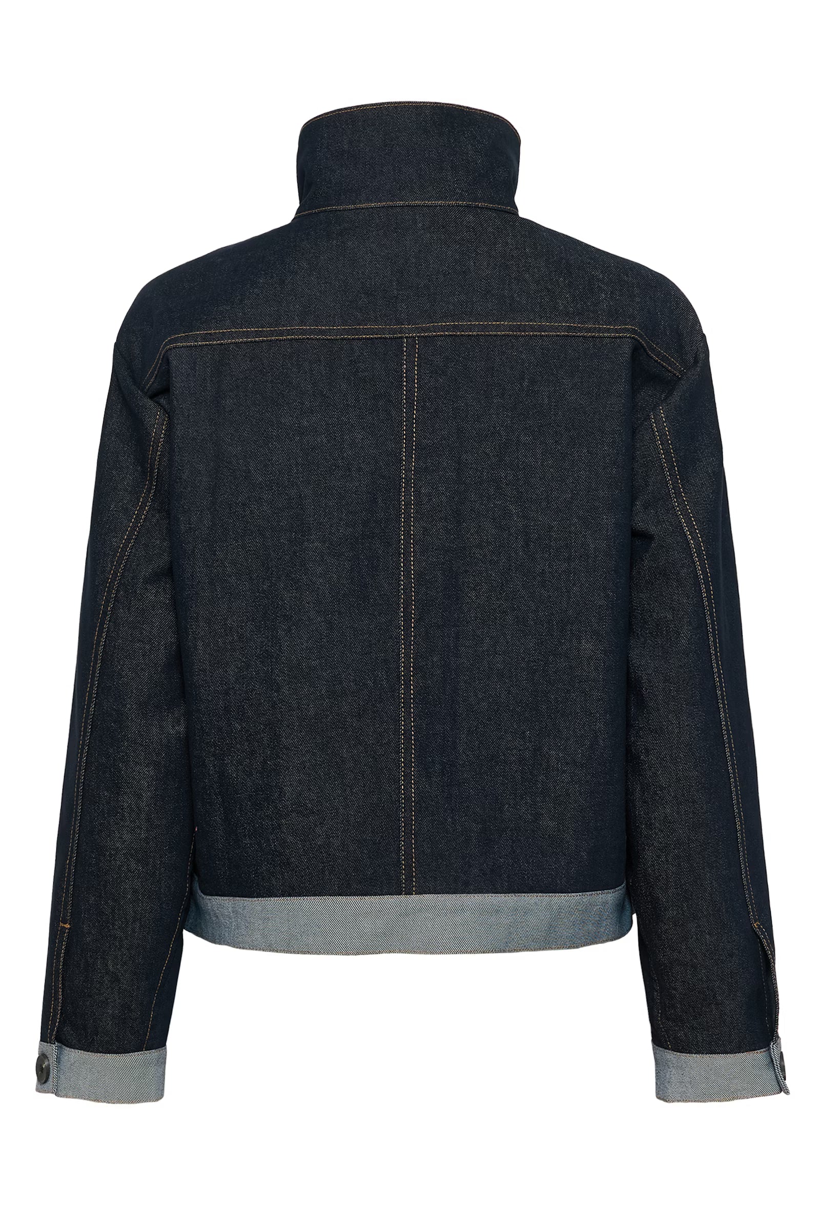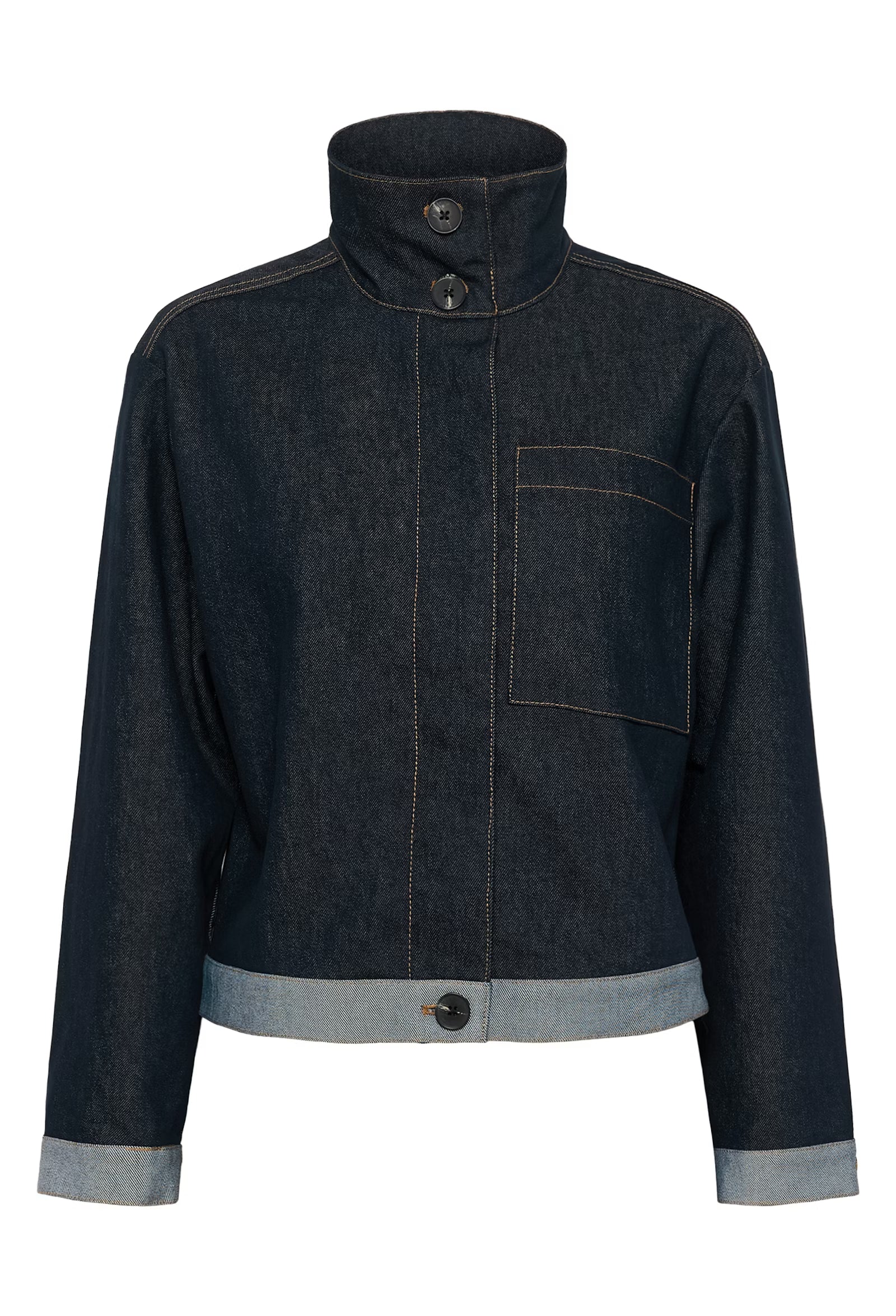 Denim jacket with structured fit, high stand collar with button closure, statement front panel, large chest pocket and buttoned cuffs. Cropped boxy silhouette with contrast visible seams and turned-up hem detail.