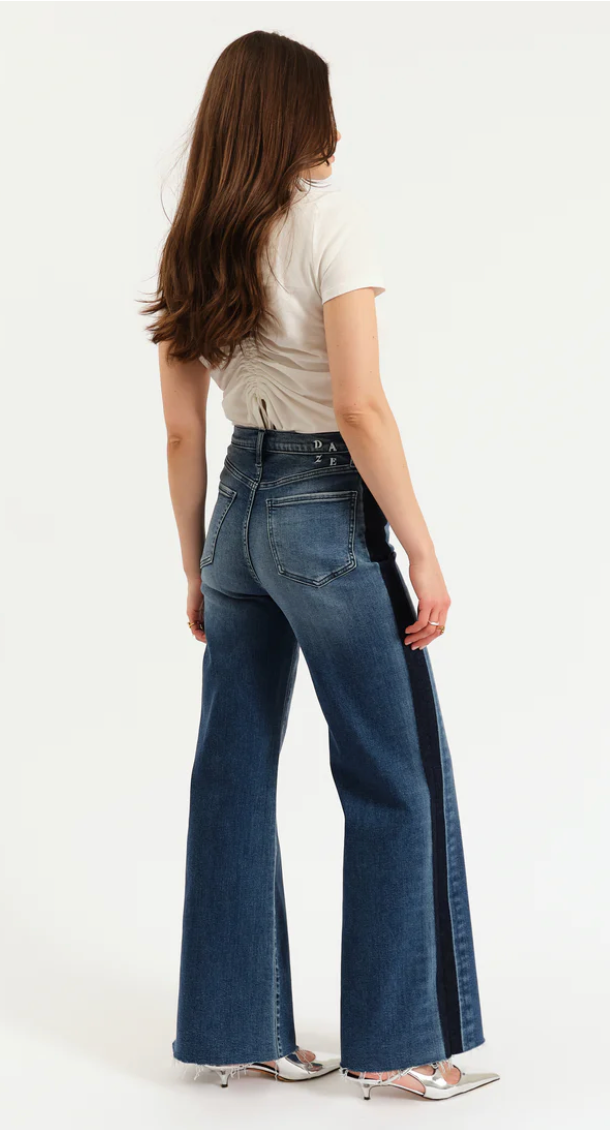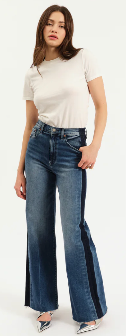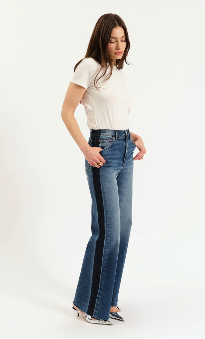 The cool girl jean just got even cooler, Far Out is a modern silhouette with black Tuxedo stripes across the sides of the legs for our take on denim tailored details. In a waist defining high rise, this wide leg is constructed in our "hug" denim that hugs your body, but has just enough weight to keep a structured fit.