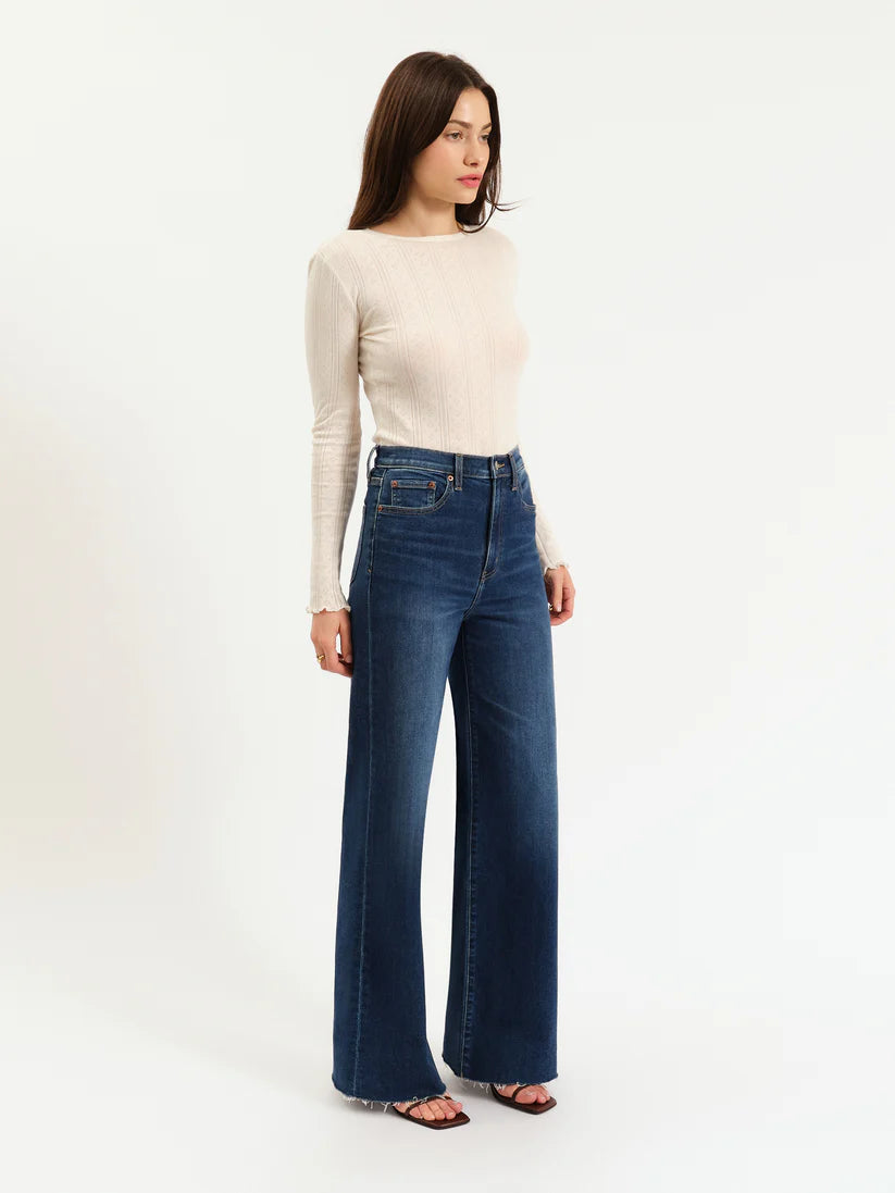 The cool girl jean, Far Out is a modern silhouette with twisted seams across the fit to give the appearance of longer legs. In a waist defining high rise, this wide leg is constructed in our "hug" denim that hugs your body, but has just enough weight to keep a structured fit.