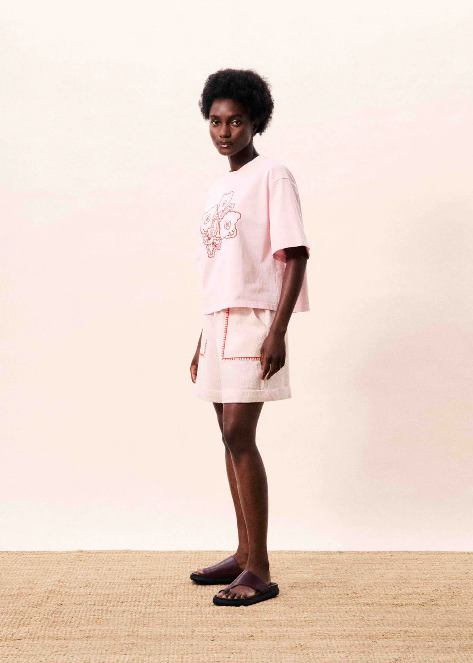 Pink cotton T-shirt with embroidered floral pattern and oversized short sleeves