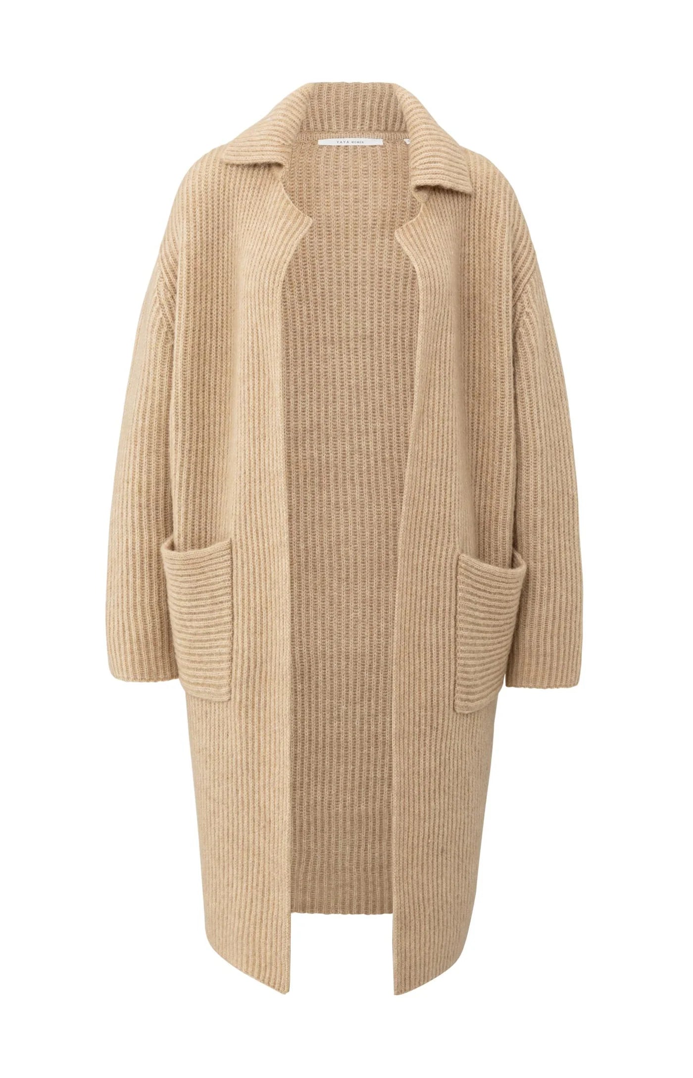 This long cardigan is crafted from a soft wool blend in a chunky knit and features a relaxed fit with dropped shoulders. Designed with a classic collar, open front, and two large patch pockets. The ribbed texture adds warmth and a modern touch. The model is 173 cm and wears size S