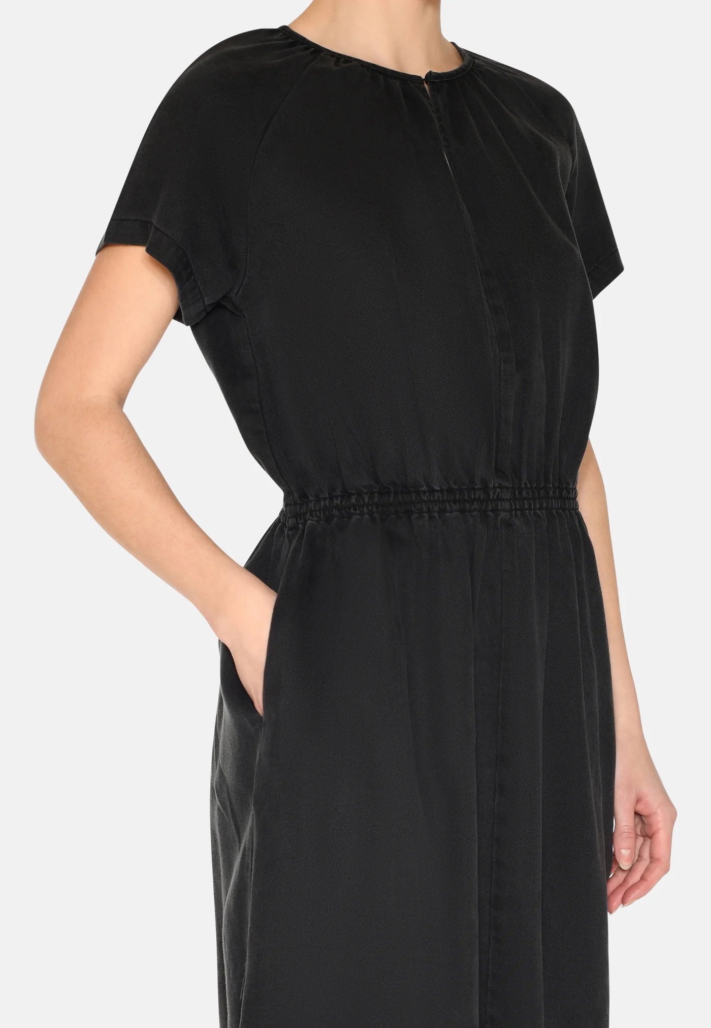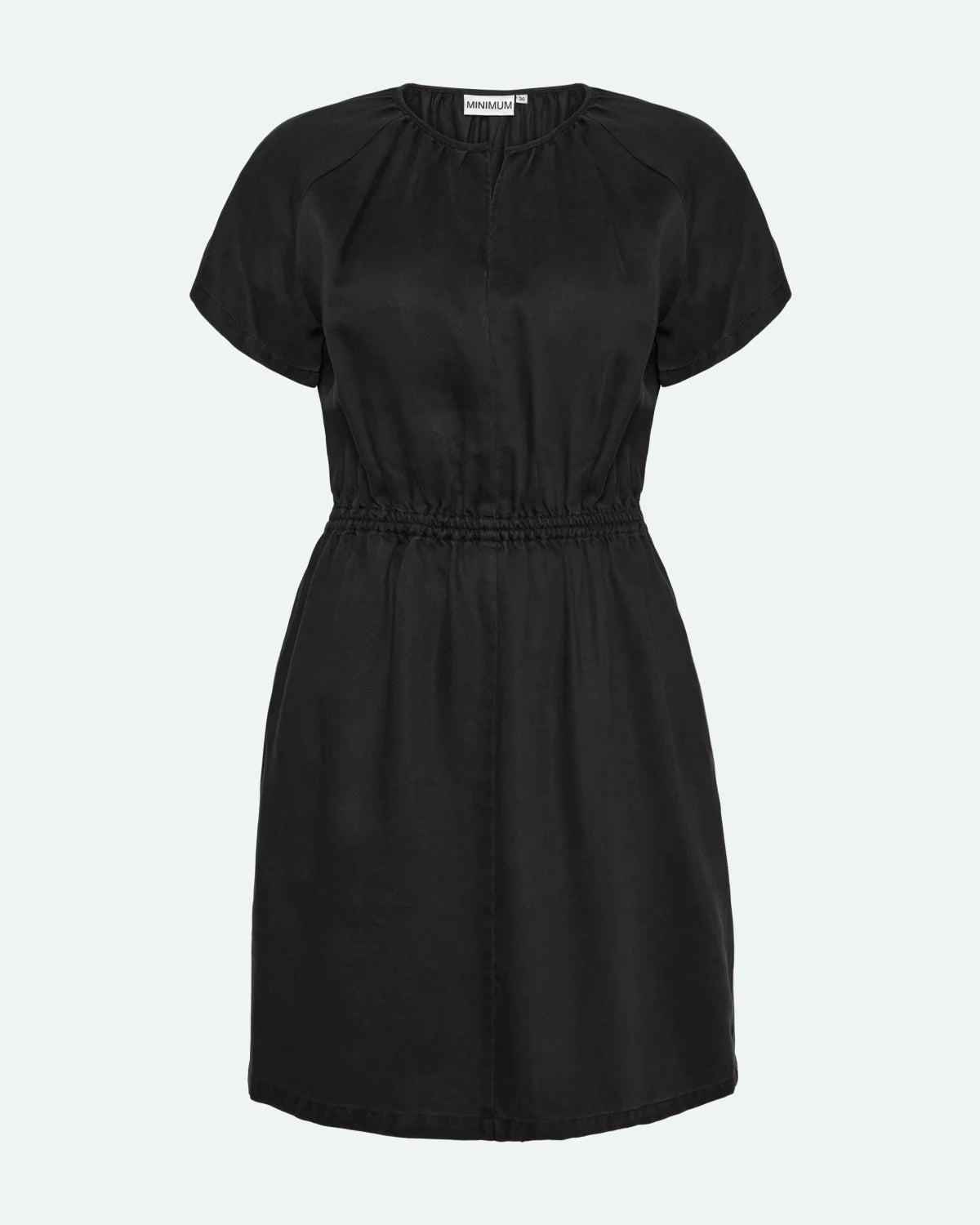 With short sleeves and a round neck with a small slit, the dress gives a fresh and modern expression. The elastic waist highlights the feminine silhouette and creates a beautiful shape, without compromising on comfort. The simple design makes the dress easy to style, and the classic details add a subtle yet sophisticated touch.