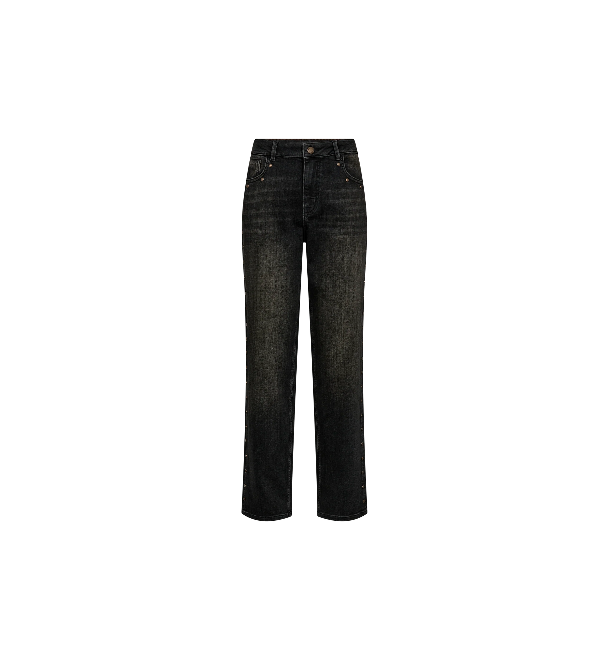 Channelling a cool vibe, these mid-waist boyfriend jeans are crafted for effortless comfort with their regular fit. Featuring classic five-pocket detailing, a button and zip fastening, and denim studs at the front pockets, they bring a touch of edge to any ensemble. We love to pair them with a cosy chunky knit or a tailored shirt and blazer for a versatile look.