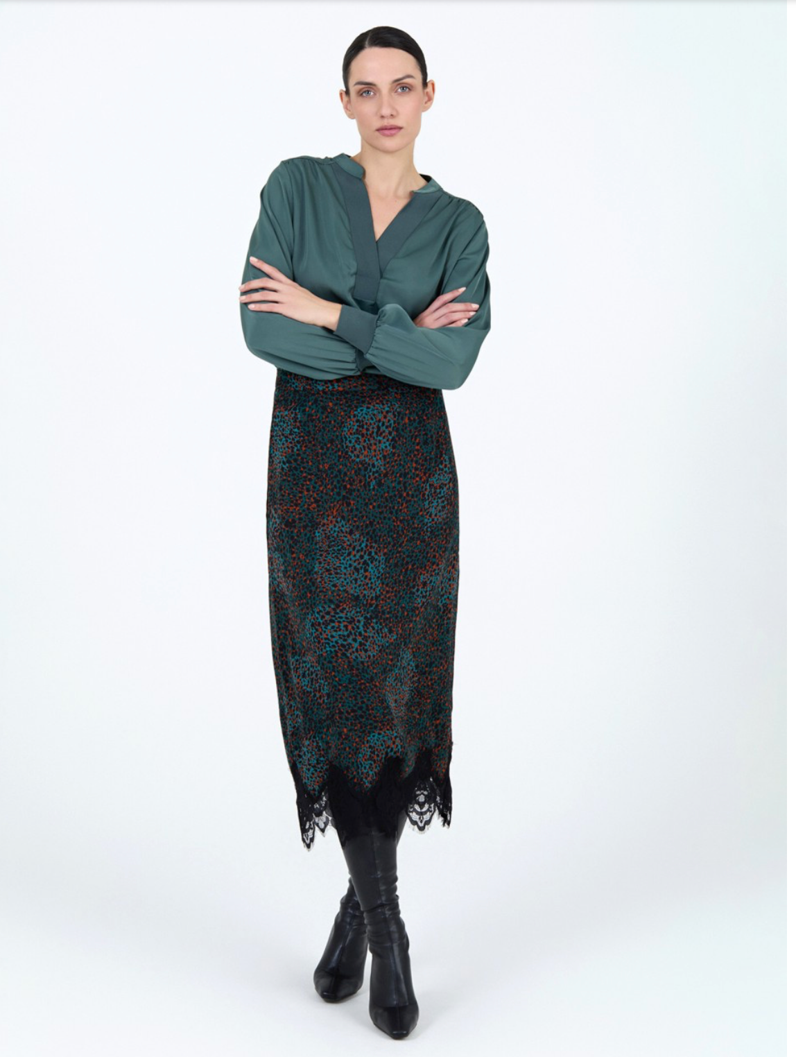 Beautiful satin blouse with ribbed detail trim on v-neck.