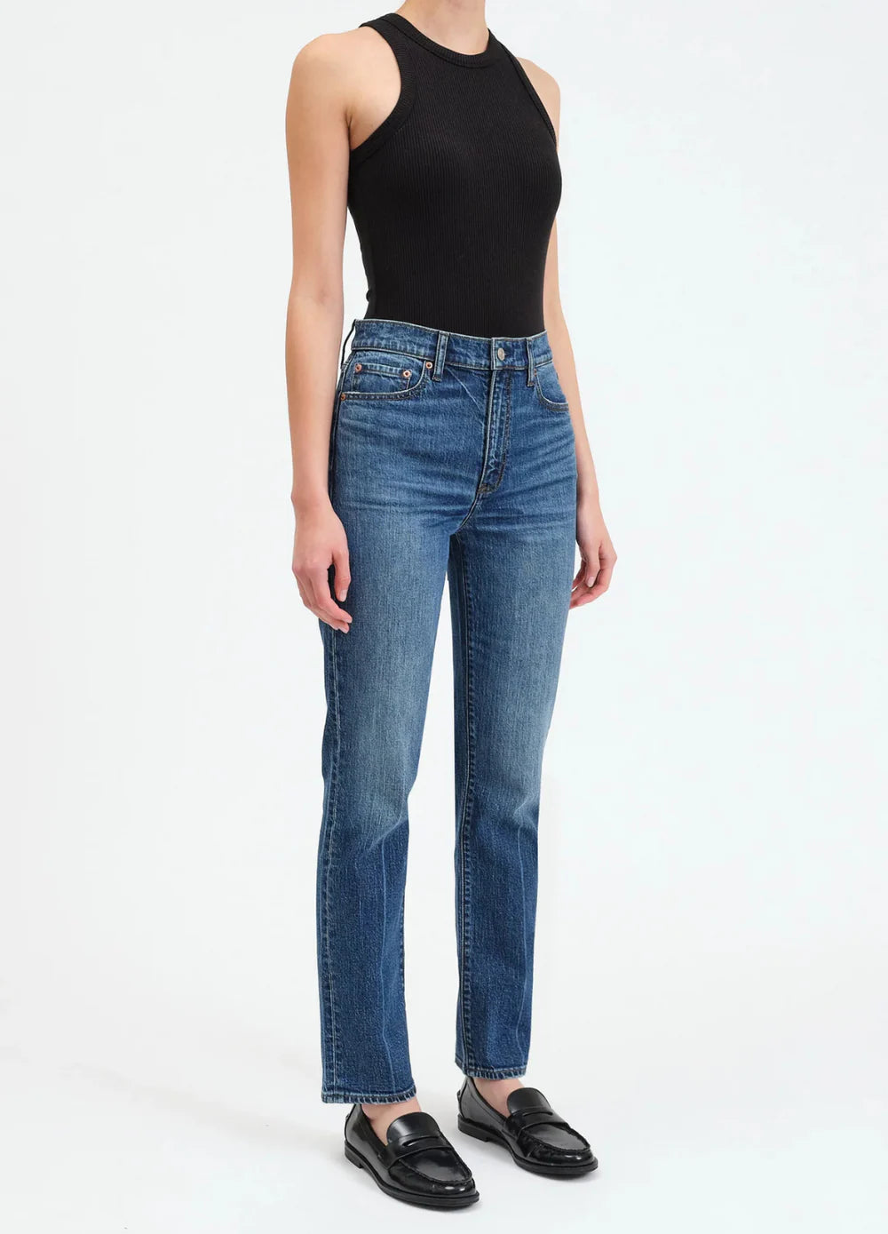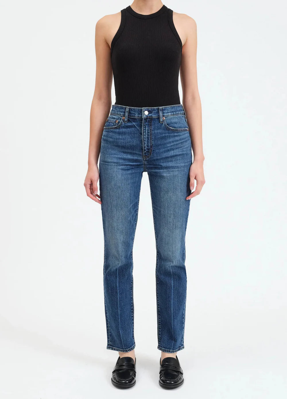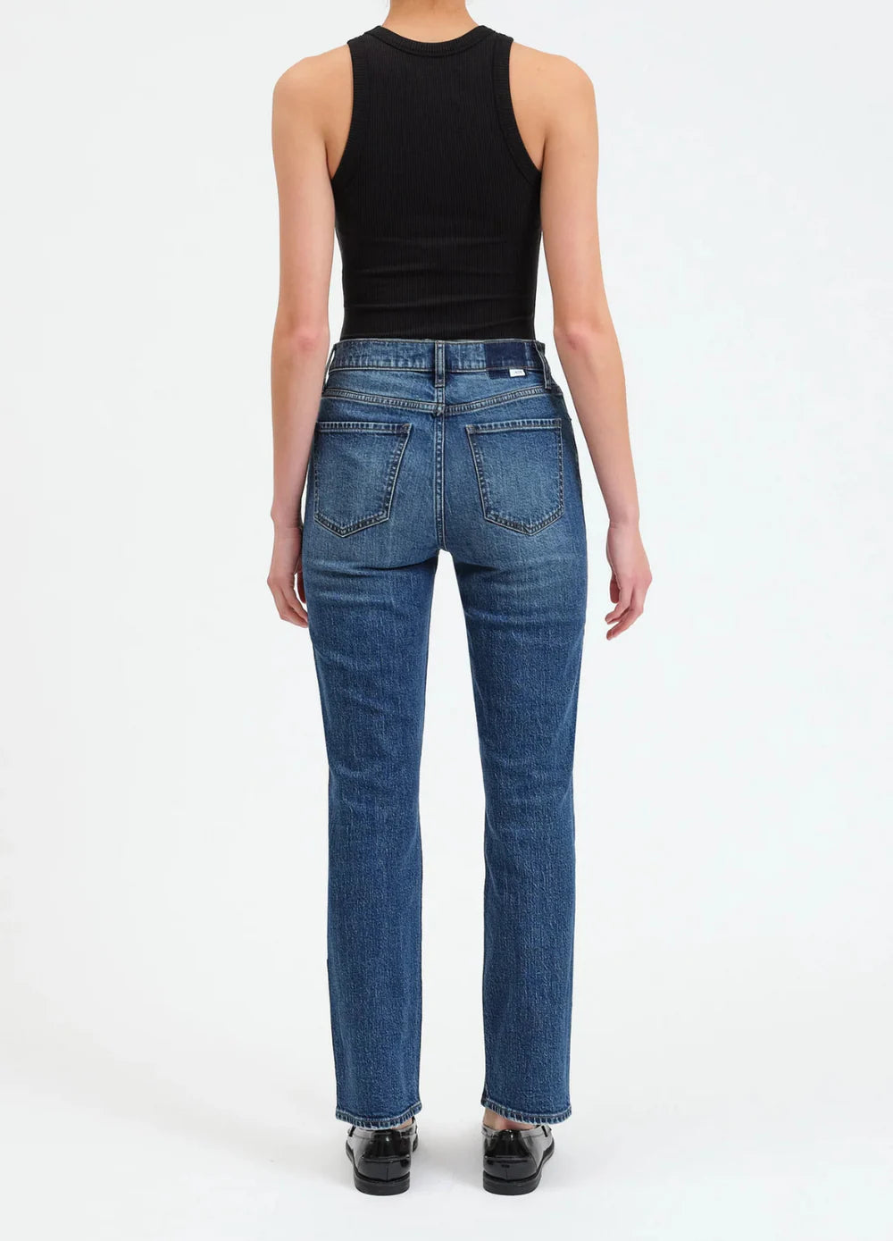 This waist defining, high rise jean is created in a timeless medium wash, with gentle knicks to give it a true been-around-for-decades vintage look. It is crafted from our "Tough Love" fabric that gives the jean structure, with just a touch of stretch.