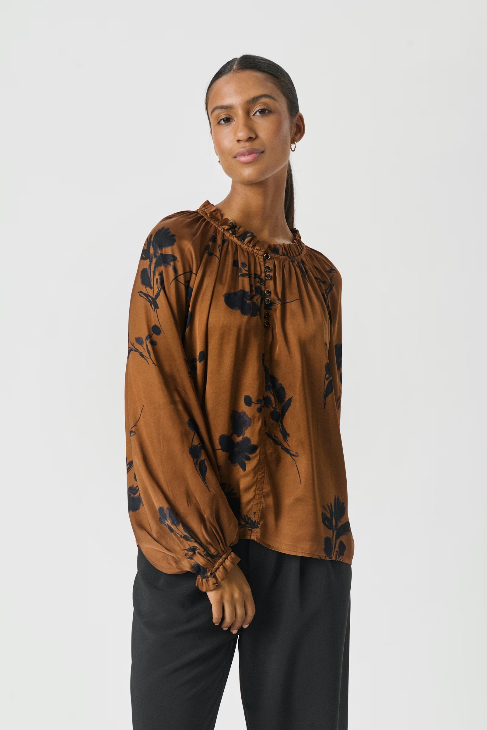 The model is 174 cm tall and wears a size 36. This blouse in a warm brown tone with a dark floral print features a round neckline with ruffle trim and delicate front buttons. The soft fabric and airy balloon sleeves create a feminine and comfortable look – ideal for everyday wear or evenings out.
